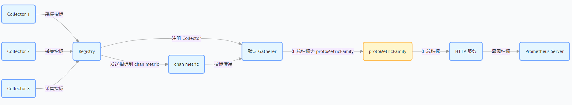 - 启动 HTTP 服务,当 Prometheus 请求/metrics时,Registry(作为 Gatherer)调用所有 Collector 的Collect方法,收集指标样本。