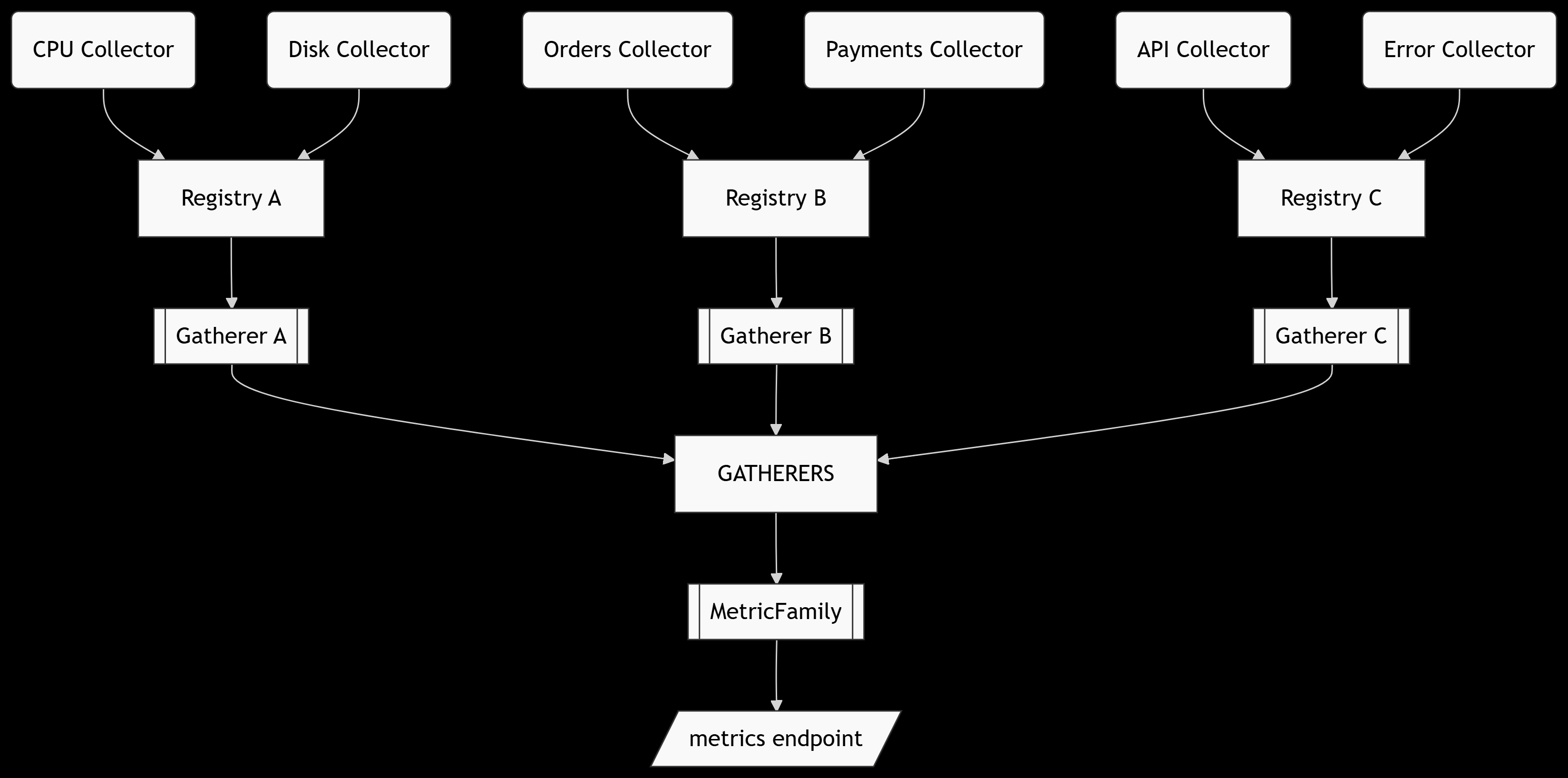 - 独立 Gatherer 实例:每个 Gatherer 可关联不同的 Collector 集合,例如: