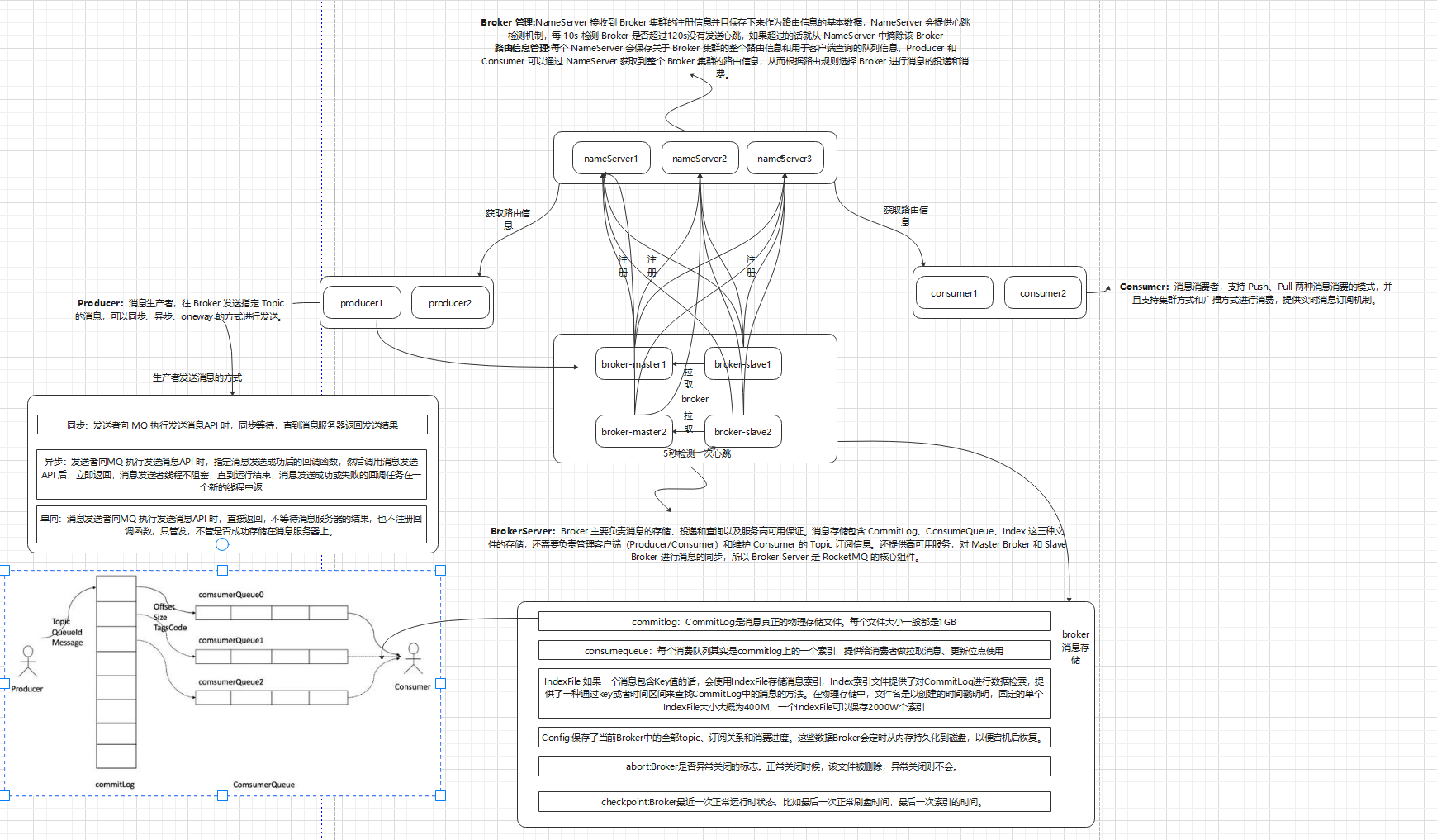 - NameServer:整个集群的注册中心和配置中心,管理集群的元数据。包括 Topic 信息和路由信息、Producer 和 Consumer 的客户端注册信息、Broker 的注册信息。