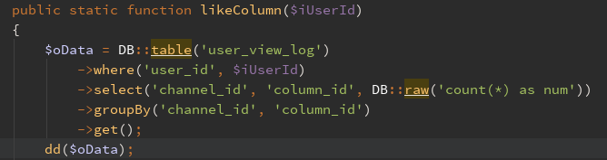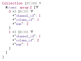 ->select('channel_id', 'column_id', DB::raw('count(*) as num')) 其中的字段是我们所需要返回的字段(看下方的打印结果)