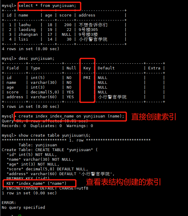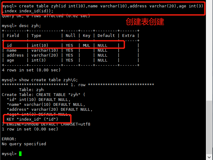 create table zyh(id int(10),name varchar(10),address varchar(20),age int(3),index index_id(id));