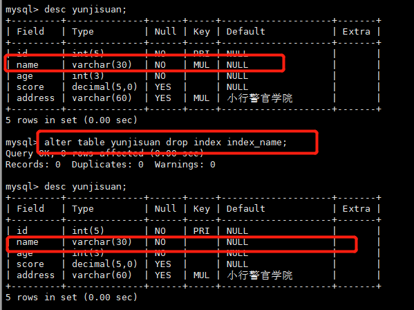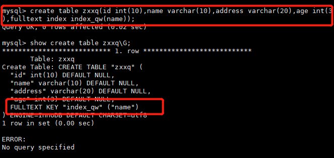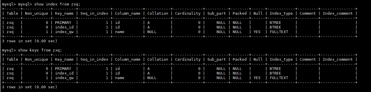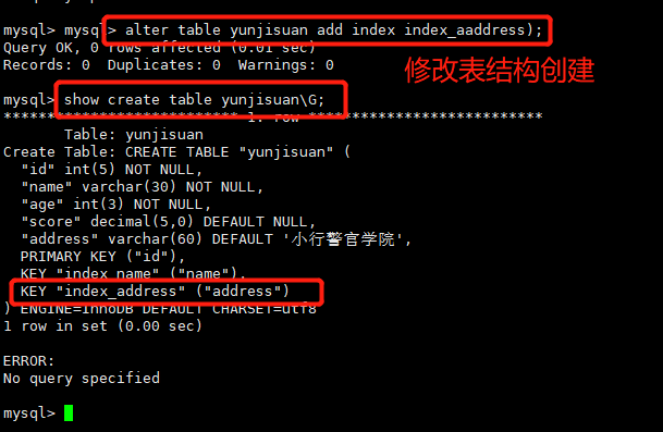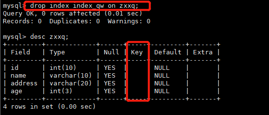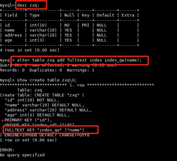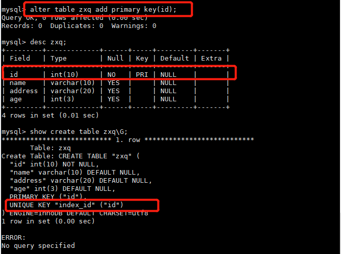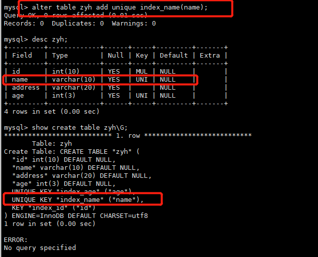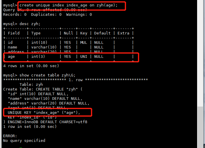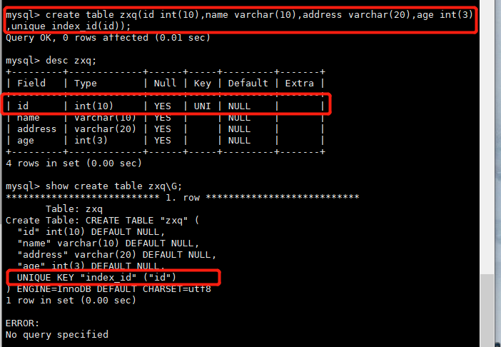create table zxq(id int(10),name varchar(10),address varchar(20),age int(3),unique index_id(id));