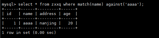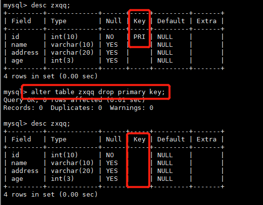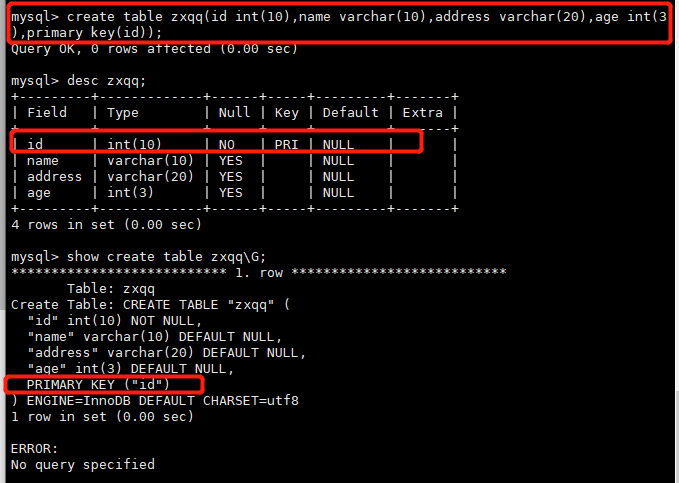 create table zxqq(id int(10),name varchar(10),address varchar(20),age int(3),primary key(id));