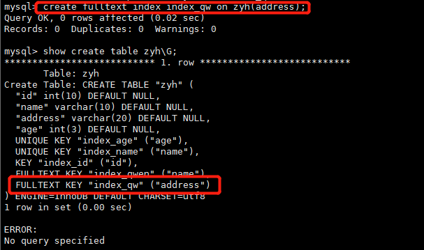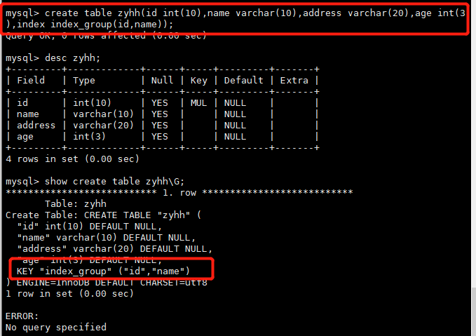 create table zyhh(id int(10),name varchar(10),address varchar(20),age int(3),index index_group(id,name));