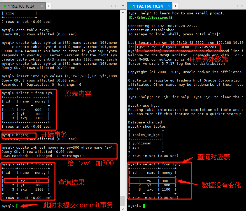 BEGIN 或 START TRANSACTION:显式地开启一个事务。
