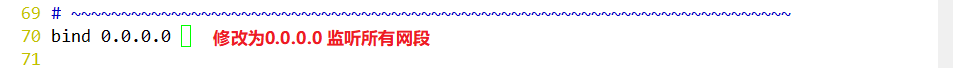 bind 0.0.0.0 #70行,修改bind 项,0.0.0.0监听所有网段