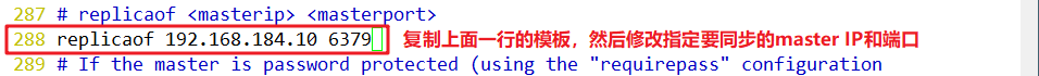 replicaof 192.168.184.10 6379 #288行,指定要同步的Master节点IP和端口
