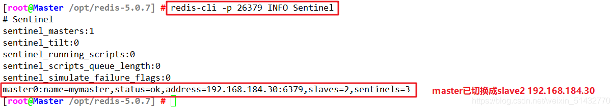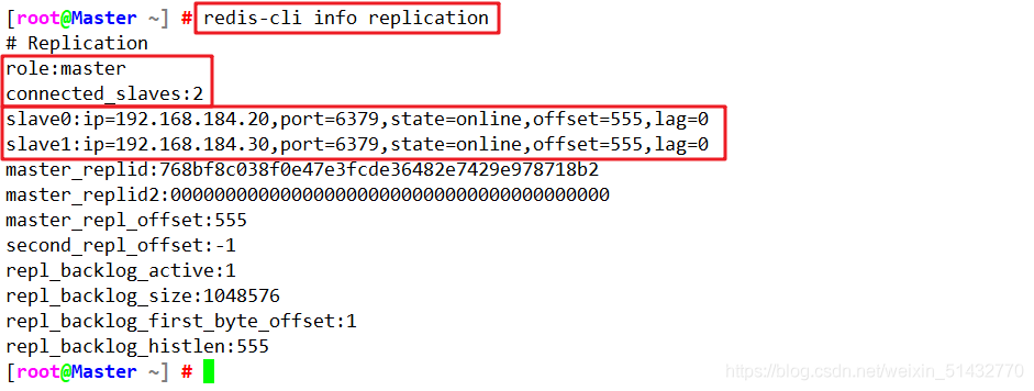 slave0:ip=192.168.184.20,port=6379,state=online,offset=555,lag=0