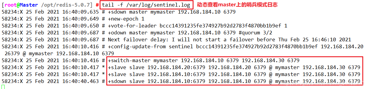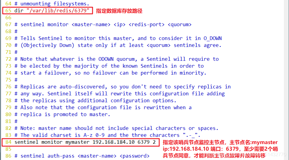 sentinel monitor mymaster 192.168.184.10 6379 2 #84行,修改 指定该哨兵节点监控192.168.184.10:6379这个主节点,该主节点的名称是mymaster,最后的2的含义与主节点的故障判定有关:至少需要2个哨兵节点同意,才能判定主节点故障并进行故障转移