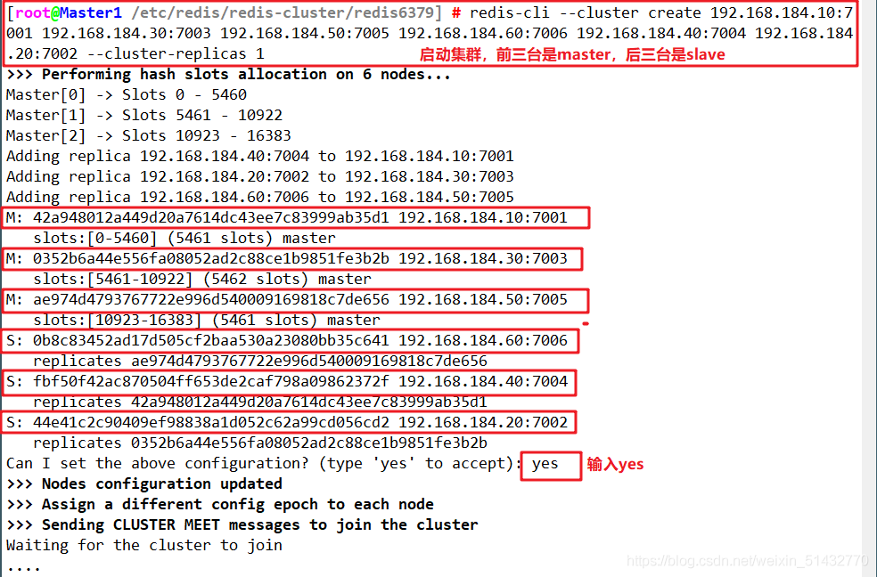 redis-cli --cluster create 192.168.184.10:7001 192.168.184.30:7003 192.168.184.50:7005 192.168.184.60:7006 192.168.184.40:7004 192.168.184.20:7002 --cluster-replicas 1