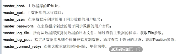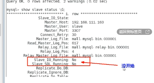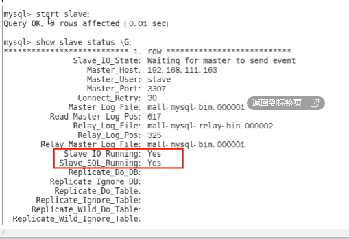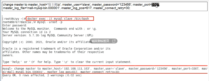 change master to master_host=宿主机ip,master_user='slave',master_password='123456',master_port=3307,master_log_file='mall-mysql-bin.000001',master_log_pos=617,master_connect_retry=30;