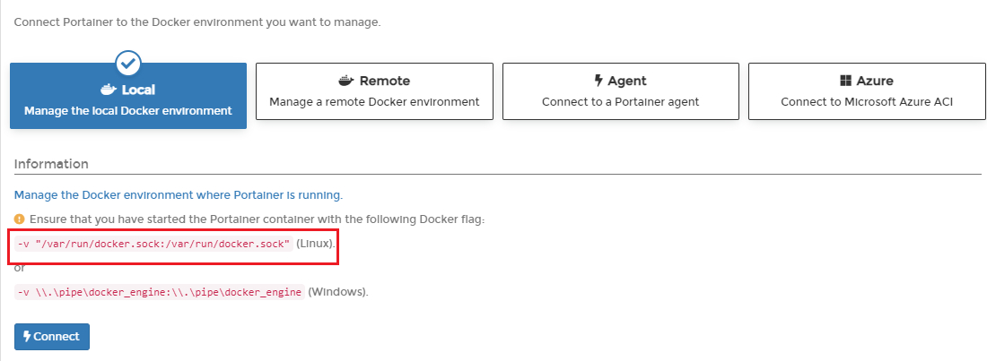 只能在创建 Portainer Server 容器时添加本地环境。部署 Portainer 后,您无法添加本地环境