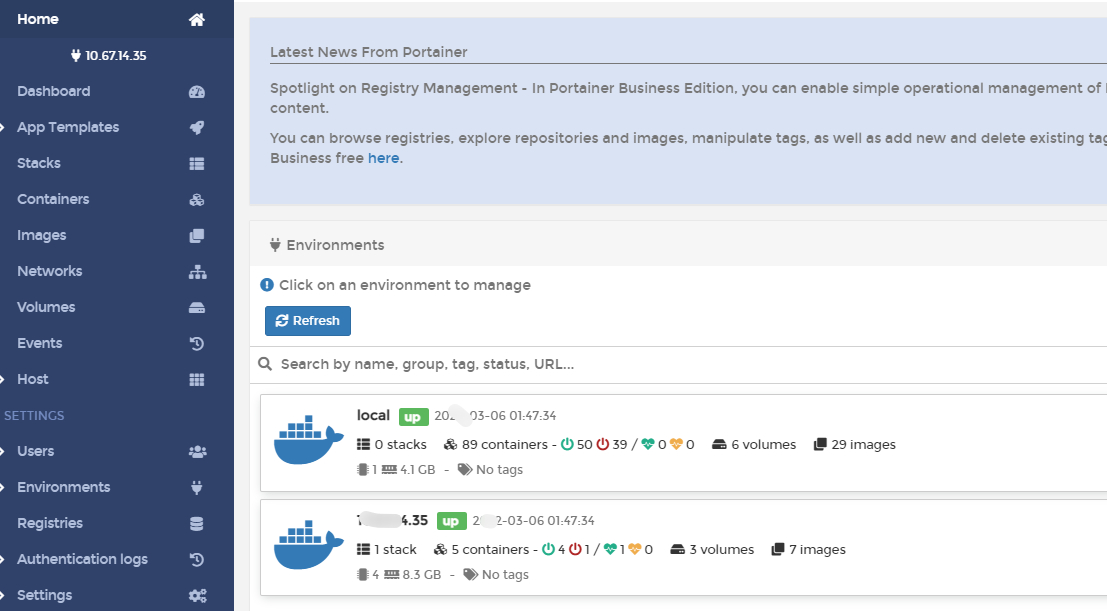 通过该方式,可以将远程机器添加到Portainer服务端,统一管理远程机器上的容器环境