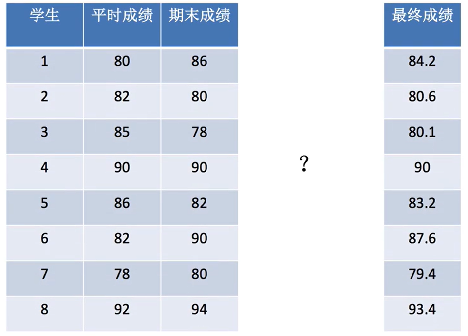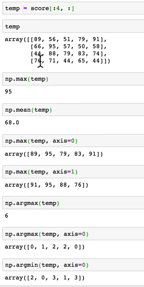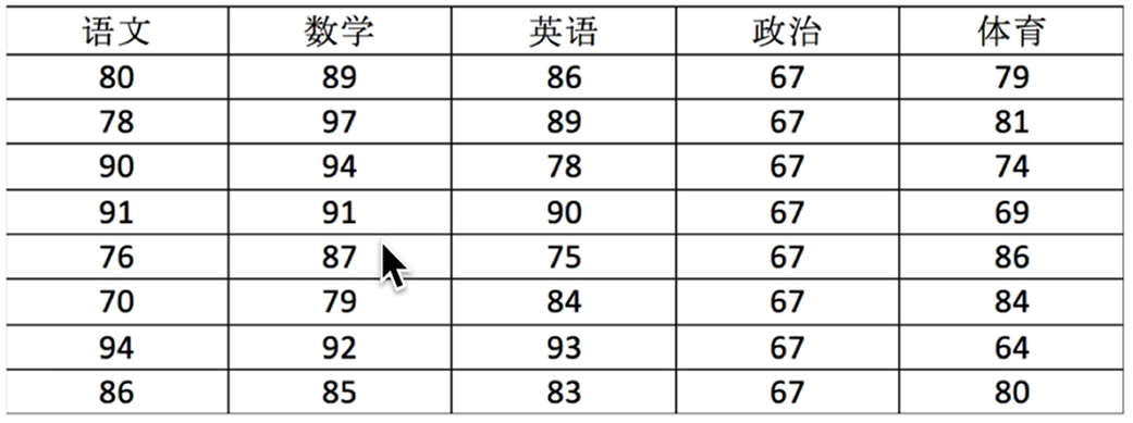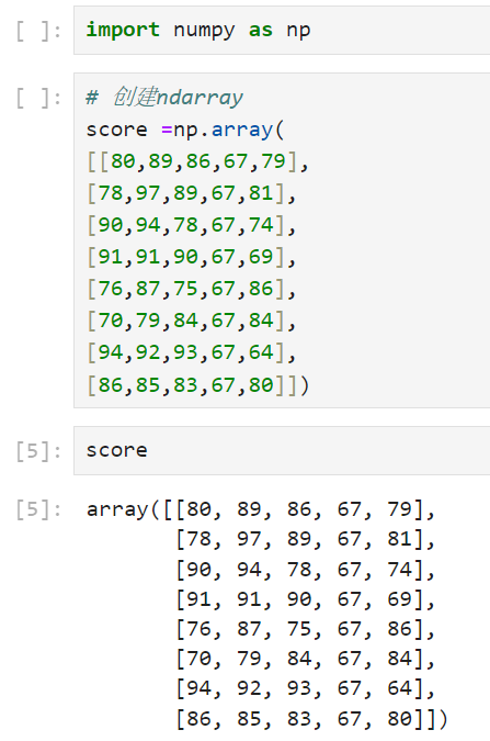 import numpy as np # 创建ndarray score =np.array( [[80,89,86,67,79], [78,97,89,67,81], [90,94,78,67,74], [91,91,90,67,69], [76,87,75,67,86], [70,79,84,67,84], [94,92,93,67,64], [86,85,83,67,80]])