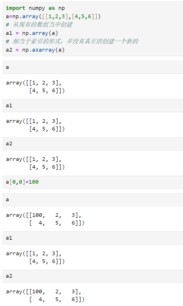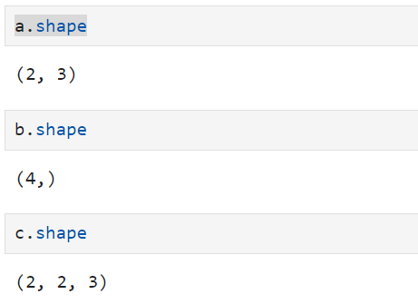 import numpy as np # 创建不同形状的数组 a = np.array([[1,2,3],[4,5,6]]) b = np.array([1,2,3,4]) c = np.array([[[1,2,3],[4,5,6]],[[1,2,3],[4,5,6]]])