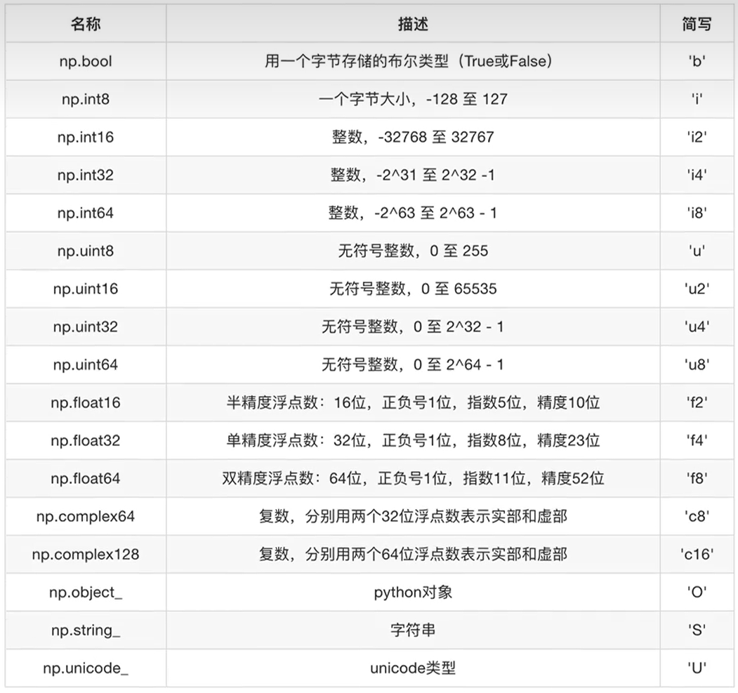 dtype是numpy.dtype类型,先看看对于数组来说有哪些类型