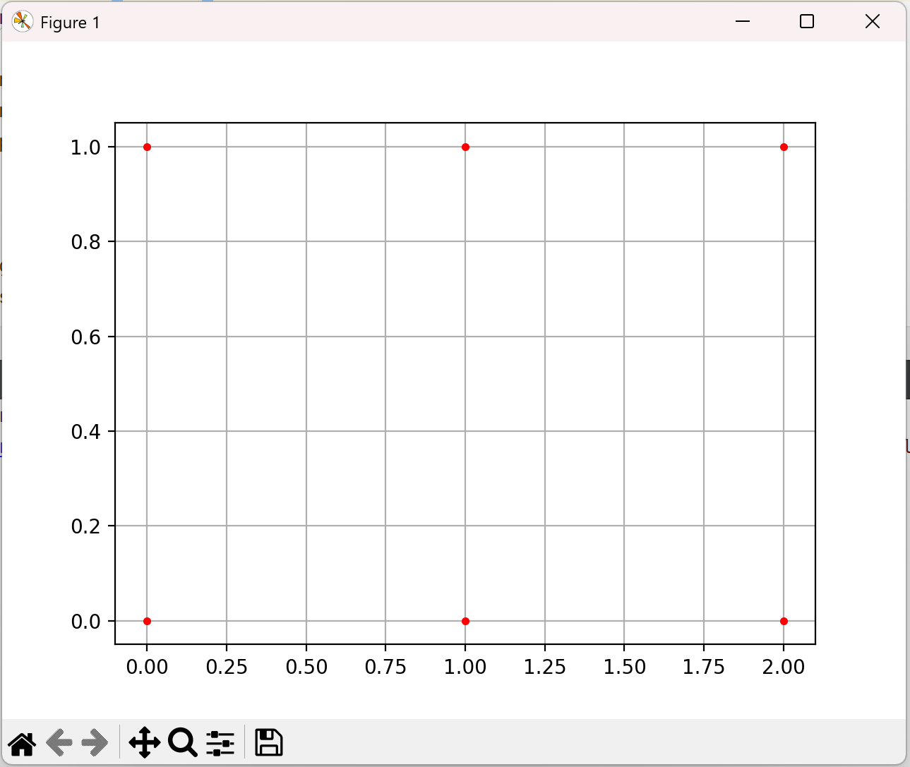 import matplotlib matplotlib.use('TkAgg') import matplotlib.pyplot as plt x = np.array([[0, 1, 2], [0, 1, 2]]) # 2行3列的二维数组 y = np.array([[0, 0, 0], [1, 1, 1]]) # 2行3列的二维数组 plt.plot(x, y, color='red', # 全部点设置为红色 marker='.', # 点的形状为圆点 linestyle='') # 线型为空,也即点与点之间不用线连接 plt.grid(True) plt.show()