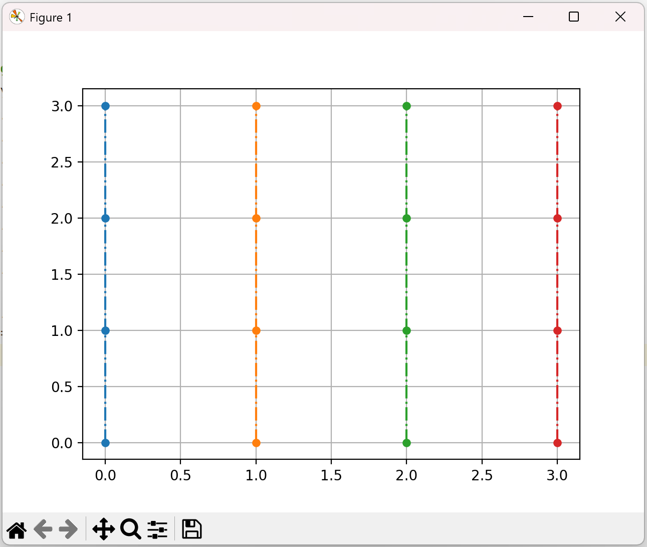 # 用矩阵的形式(坐标矩阵)来批量描述这些点的坐标 x = np.array([[0, 1, 2, 3], [0, 1, 2, 3], [0, 1, 2, 3], [0, 1, 2, 3]]) y = np.array([[0, 0, 0, 0], [1, 1, 1, 1], [2, 2, 2, 2], [3, 3, 3, 3]]) plt.plot(x, y, marker='.', # 点的形状为圆点 markersize=10, # 点设置大一点,看着清楚 linestyle='-.') # 线型为点划线 plt.grid(True) plt.show()