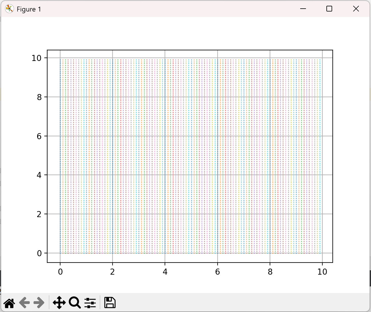 import torch import numpy as np import matplotlib matplotlib.use('TkAgg') import matplotlib.pyplot as plt x = np.arange(0,10,0.1) # arange 创建等差数组 - 指定步长 print(x) print(x.shape) # (200,) 表示1维数组 y = np.arange(0,10,0.1) print(y) print(y.shape) xx,yy=np.meshgrid(x,y) # xx为横坐标矩阵,yy为纵坐标矩阵 print(xx) # xx为横坐标矩阵 print(yy) # yy为纵坐标矩阵 plt.plot(xx, yy, marker='.', # 点的形状为圆点 markersize=0.5, # 点设置大一点,看着清楚 linestyle='') # 线型为点划线 plt.grid(True) plt.show()