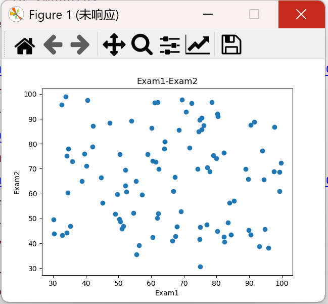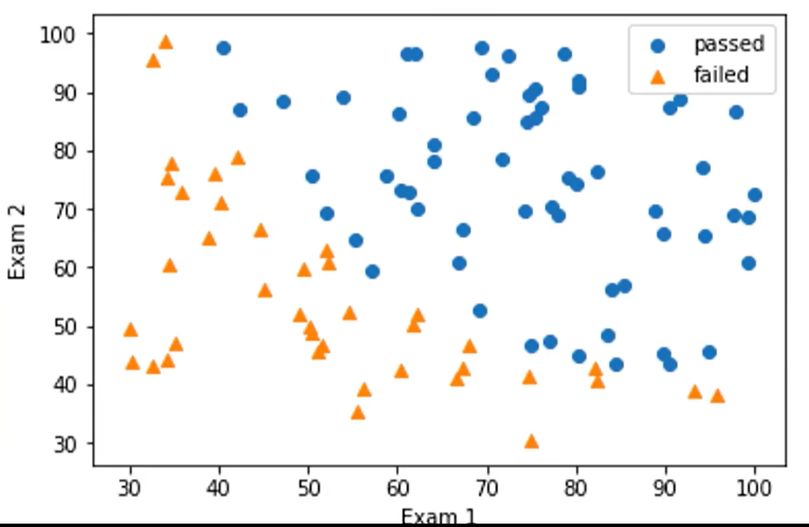 # 将数据赋值给相关变量 x = data.drop(['Pass'], axis=1) # 这里是去除pass那一列,axis=1表示去除这一列 y = data.loc[:, 'Pass'] # 将pass那一列的值赋给y x1 = data.loc[:, 'Exam1'] # 将Exam1那一列的值赋给x1 x2 = data.loc[:, 'Exam2'] # 将Exam2那一列的值赋给x2