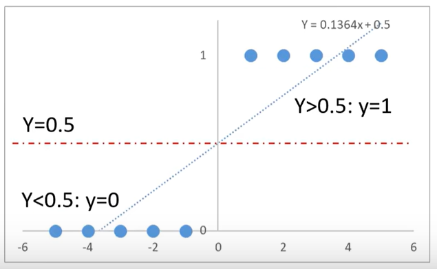 再基于分布函数判断是0还是1.y>0.5:y=1;y<0.5:y=0,这样就完成了一个简单的分类问题预测。