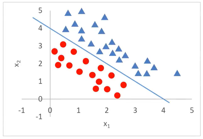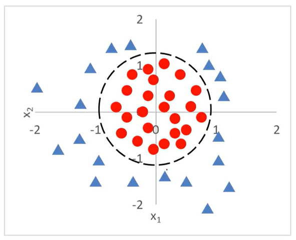 当分类任务变得更为复杂:原来只有一个维度即x,这里增加了一个维度,即x1,x2,x1,x2 均为输入,而三角形和圆形则为输出。