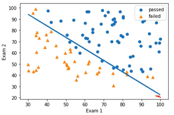 # θ0,θ1,θ2 theta0 = LR.intercept_ theta1,theta2 = LR.coef_[0][0],LR.coef_[0][1] print(theta0,theta1,theta2) x2_new = -(theta0+theta1*x1)/theta2 print(x2_new)