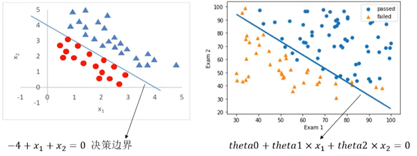 此时-4+x1+x2 =0这条边界就叫决策边界(Decision boundary)