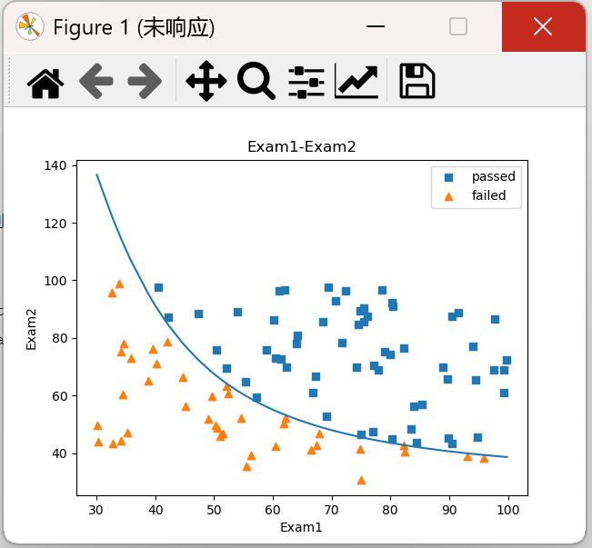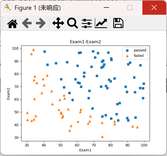 #加载数据 import torch import pandas as pd import numpy as np # 原始数据绘图 from matplotlib import pyplot as plt data = pd.read_csv('./data/examdata.csv') #增加标签mask mask = data.loc[:,'Pass'] == 1 #如果Pass列的值等于1,则mask的值为true print(mask) passed = plt.scatter(data.loc[:, 'Exam1'][mask], data.loc[:, 'Exam2'][mask],marker='s') # 绘制pass值为true的点 failed = plt.scatter(data.loc[:, 'Exam1'][~mask], data.loc[:, 'Exam2'][~mask],marker='^') # ~表示取反 plt.title('Exam1-Exam2') plt.xlabel('Exam1') plt.ylabel('Exam2') plt.legend((passed,failed),('passed','failed')) plt.show()