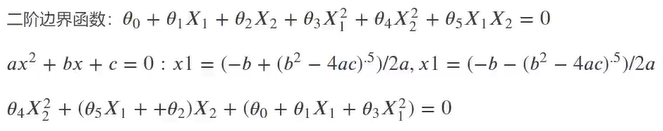 我们先根据θ0 、 θ1 、 θ2 、 θ3 、 θ4 、 θ5 和X1的值计算出a、b、c,然后根据a、b、c的值计算出x2的值,有了x2的值就可以画出边界函数图像。