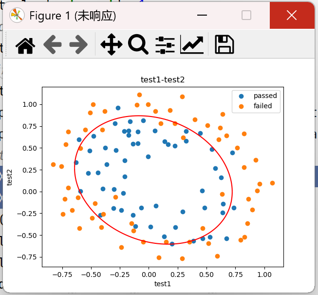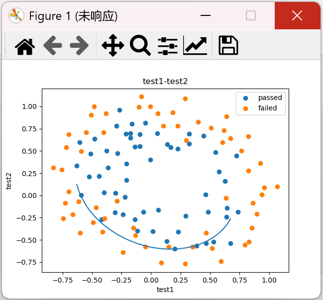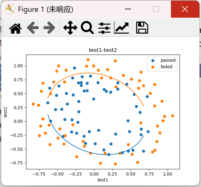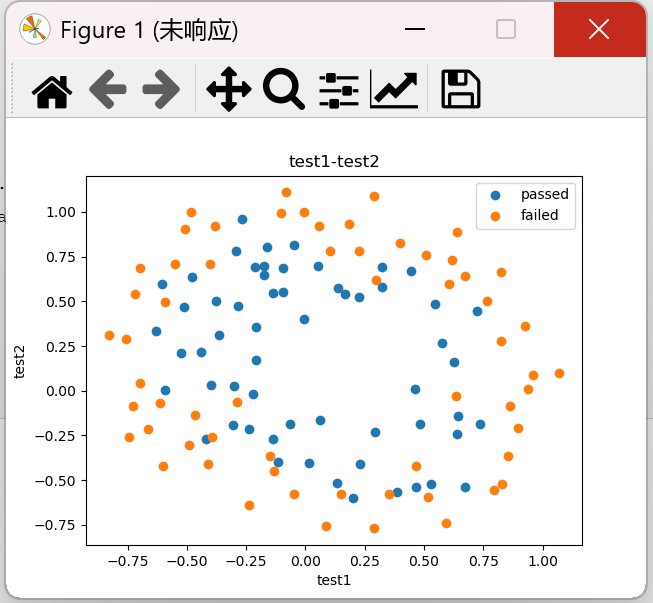 #添加标记 mask = data.loc[:,'pass']==1 print(mask) #可视化有标记的数据 fig1 = plt.figure() passed = plt.scatter(data.loc[:,'test1'][mask],data.loc[:,'test2'][mask]) failed = plt.scatter(data.loc[:,'test1'][~mask],data.loc[:,'test2'][~mask]) plt.title('test1-test2') plt.xlabel('test1') plt.ylabel('test2') plt.legend((passed,failed),('passed','failed')) plt.show()