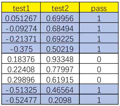 test1 test2 pass 0 0.051267 0.699560 1 1 -0.092742 0.684940 1 2 -0.213710 0.692250 1 3 -0.375000 0.502190 1 4 0.183760 0.933480 0 .. ... ... ... 113 -0.720620 0.538740 0 114 -0.593890 0.494880 0 115 -0.484450 0.999270 0 116 -0.006336 0.999270 0 117 0.632650 -0.030612 0 [118 rows x 3 columns]