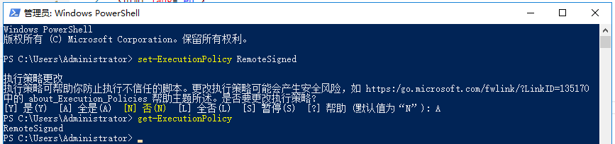 2、在“Windos PowerShell”中输入:set-ExecutionPolicy RemoteSigned
