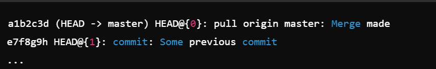从上面的输出中,你可以看到 HEAD@{0} 是当前状态(拉取之后),而 HEAD@{1} 是拉取前的状态。记住拉取之前的 HEAD(在这个例子中是 e7f8g9h)。