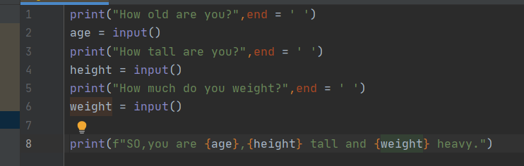 ·在前三行的输出后面都加end=''来告诉print函数不要用换行符结束这一行