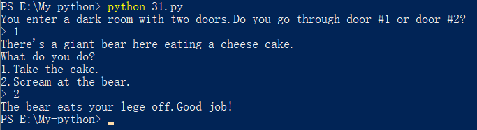 定义一个变量,用来记录用户的输入结果,依据变量值来判断if语句的分支选择:bear = input("> ")(注:》只是用户来提示用户输入,非必要存在)