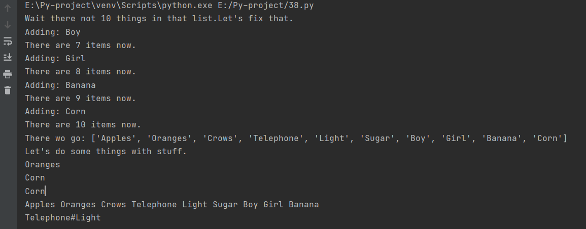 more_stuff = ["Day","Night","Song","Frisbee","Corn","Banana","Girl","Boy"]#最后入栈最先出栈