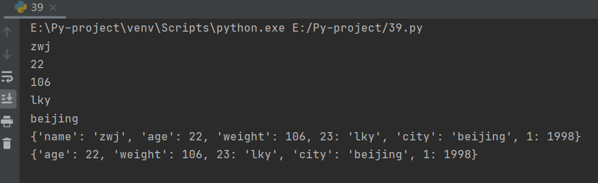 stuff = {'name':'zwj','age':22,'weight':106,23:'lky'}