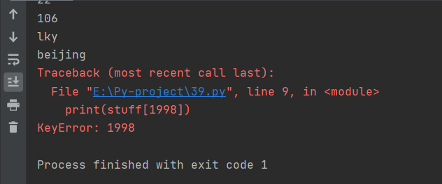 *尝试输出print(stuff[1998]),系统提示错误,表示字典中的对应值一般为根据前面的索引后面的