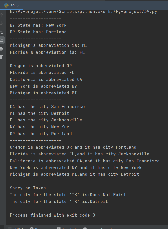 print(f"{state} is abbreviated {abbrev},and it has city {cities[abbrev]}")
