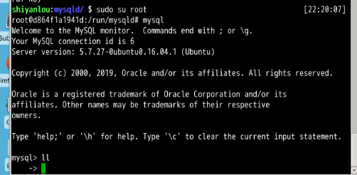 输入sudo su root,即可切到root,并拥有root的操作权限,再使用mysql,就可以直接访问mysql.如下: