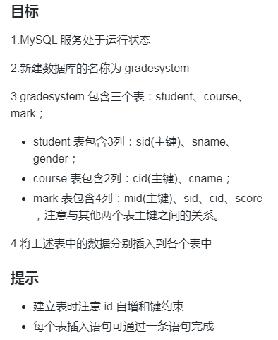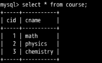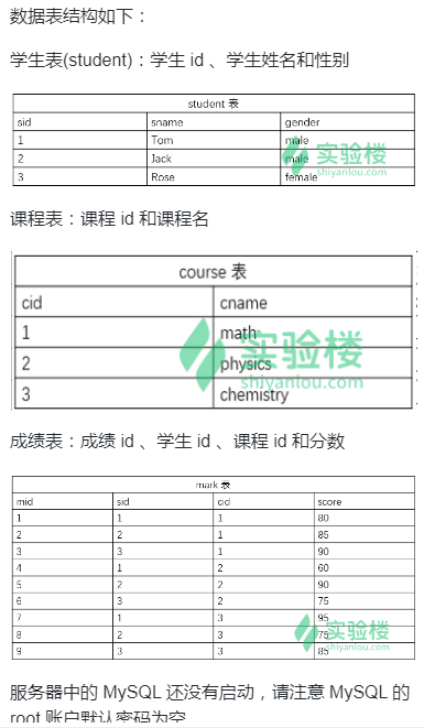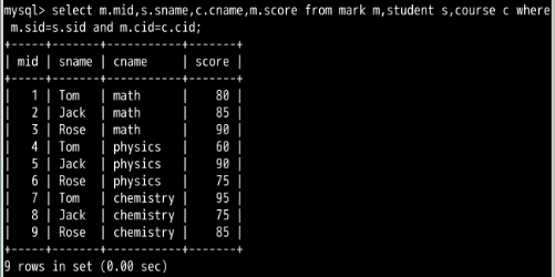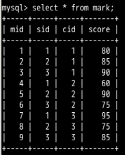 1 $ sudo service mysql start 2 3 $ mysql -u root 4 5 mysql> CREATE DATABASE gradesystem; 6 7 mysql> use gradesystem 8 9 mysql> CREATE TABLE student( 10 -> sid int NOT NULL AUTO_INCREMENT, 11 -> sname varchar(20) NOT NULL, 12 -> gender varchar(10) NOT NULL, 13 -> PRIMARY KEY(sid) 14 -> ); 15 16 mysql> CREATE TABLE course( 17 -> cid int NOT NULL AUTO_INCREMENT, 18 -> cname varchar(20) NOT NULL, 19 -> PRIMARY KEY(cid) 20 -> ); 21 22 mysql> CREATE TABLE mark( 23 -> mid int NOT NULL AUTO_INCREMENT, 24 -> sid int NOT NULL, 25 -> cid int NOT NULL, 26 -> score int NOT NULL, 27 -> PRIMARY KEY(mid), 28 -> FOREIGN KEY(sid) REFERENCES student(sid), 29 -> FOREIGN KEY(cid) REFERENCES course(cid) 30 -> ); 31 32 mysql> INSERT INTO student VALUES(1,'Tom','male'),(2,'Jack','male'),(3,'Rose','female'); 33 34 mysql> INSERT INTO course VALUES(1,'math'),(2,'physics'),(3,'chemistry'); 35 36 mysql> INSERT INTO mark VALUES(1,1,1,80),(2,2,1,85),(3,3,1,90),(4,1,2,60),(5,2,2,90),(6,3,2,75),(7,1,3,95),(8,2,3,75),(9,3,3,85);