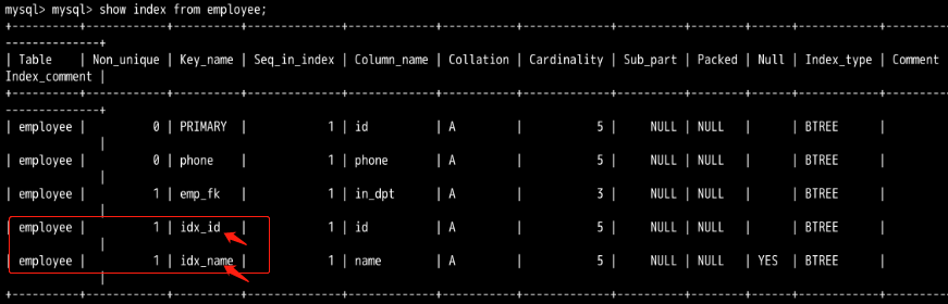 ALTER TABLE employee ADD INDEX idx_id (id); #在employee表的id列上建立名为idx_id的索引 CREATE INDEX idx_name ON employee (name); #在employee表的name列上建立名为idx_name的索引
