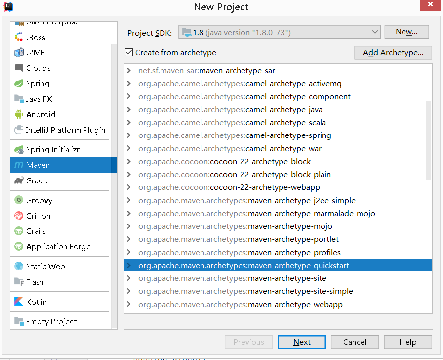 1.在idea的创建项目界面,选择maven,并选择quickstart项目,点击next