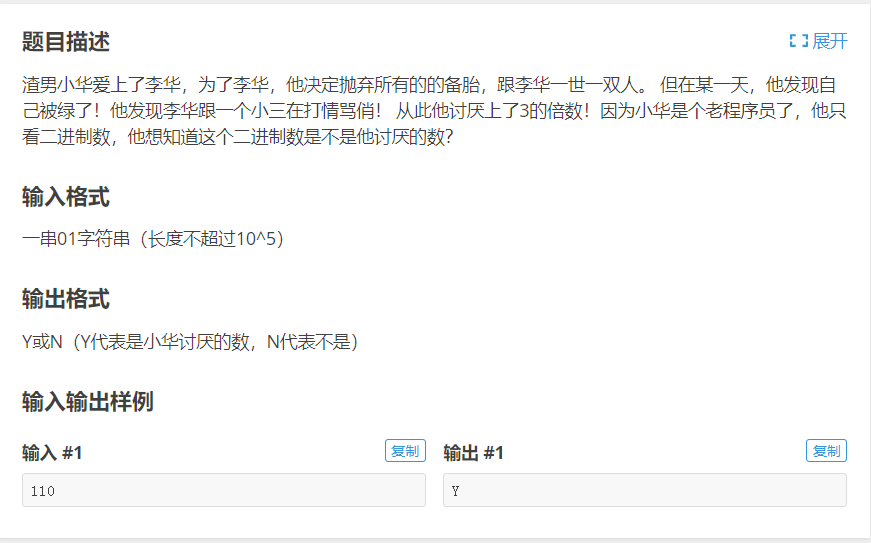 题目大意就是给出一个01串表示的二进制数是否为3的倍数。