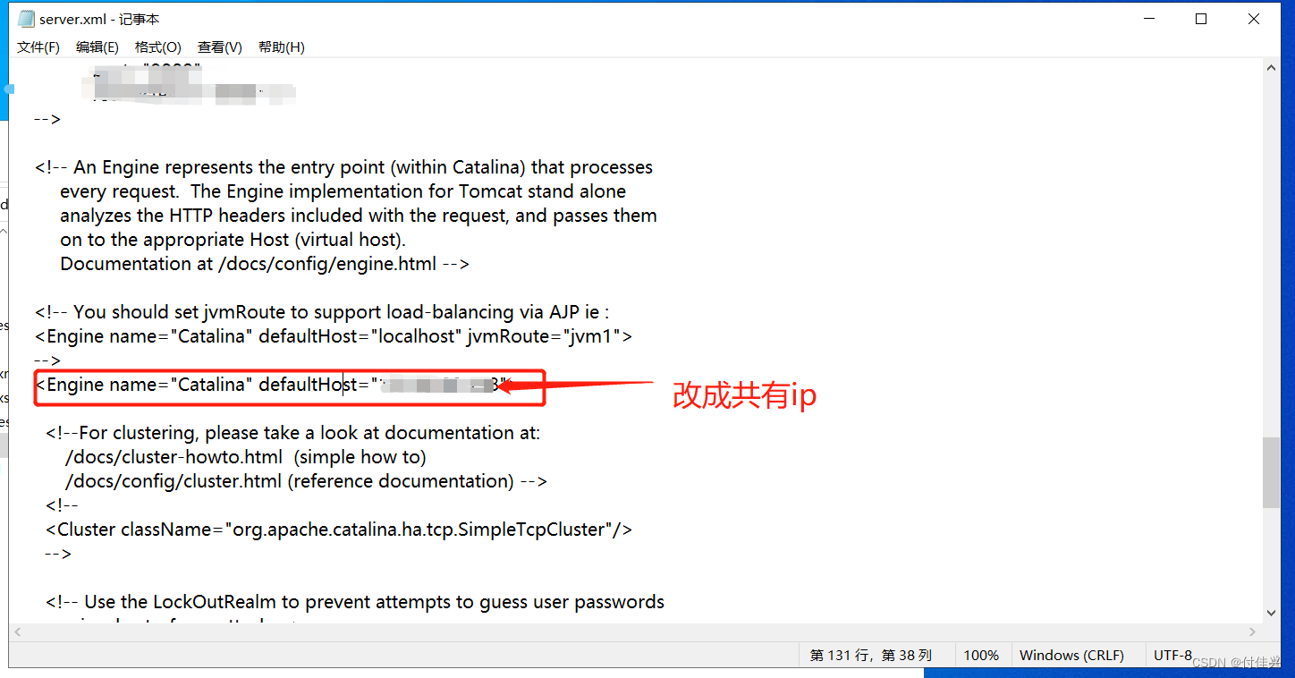 在tomcat文件夹中,找到server.xml找到如图字段替换为共有ip地址