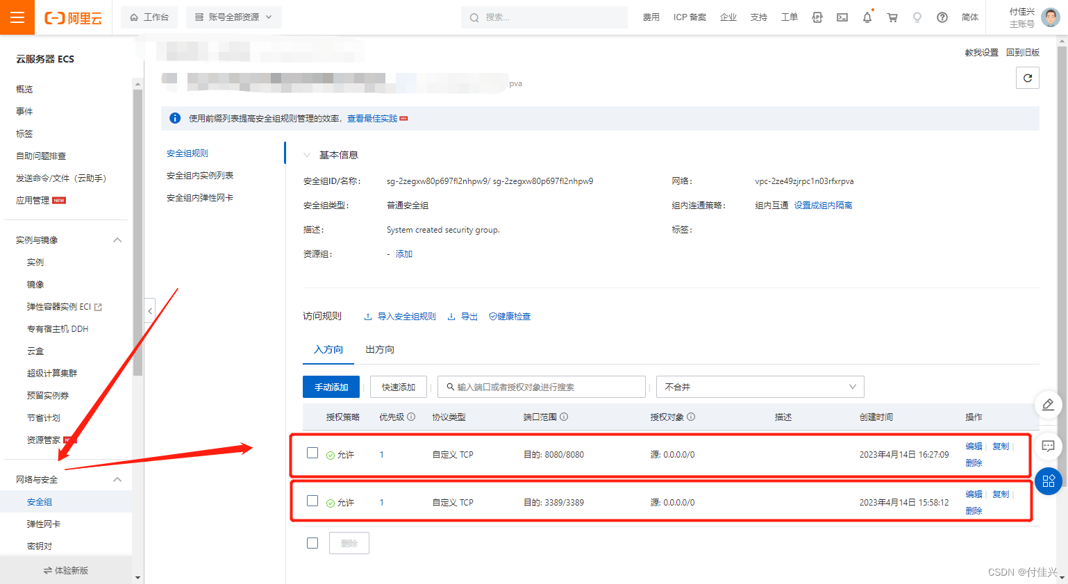 配置服务器安全组,在服务器管理界面中找到安全组