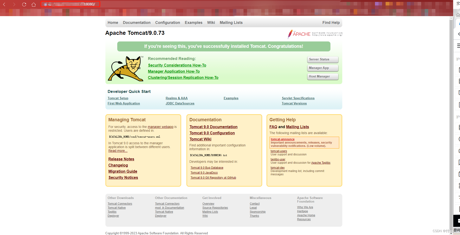 安全组中3389是远程桌面连接、8080是tomcat中设置的端口。以上操作完成后,使用外网访问下共有ip:8080就能看到tomcat的界面了。