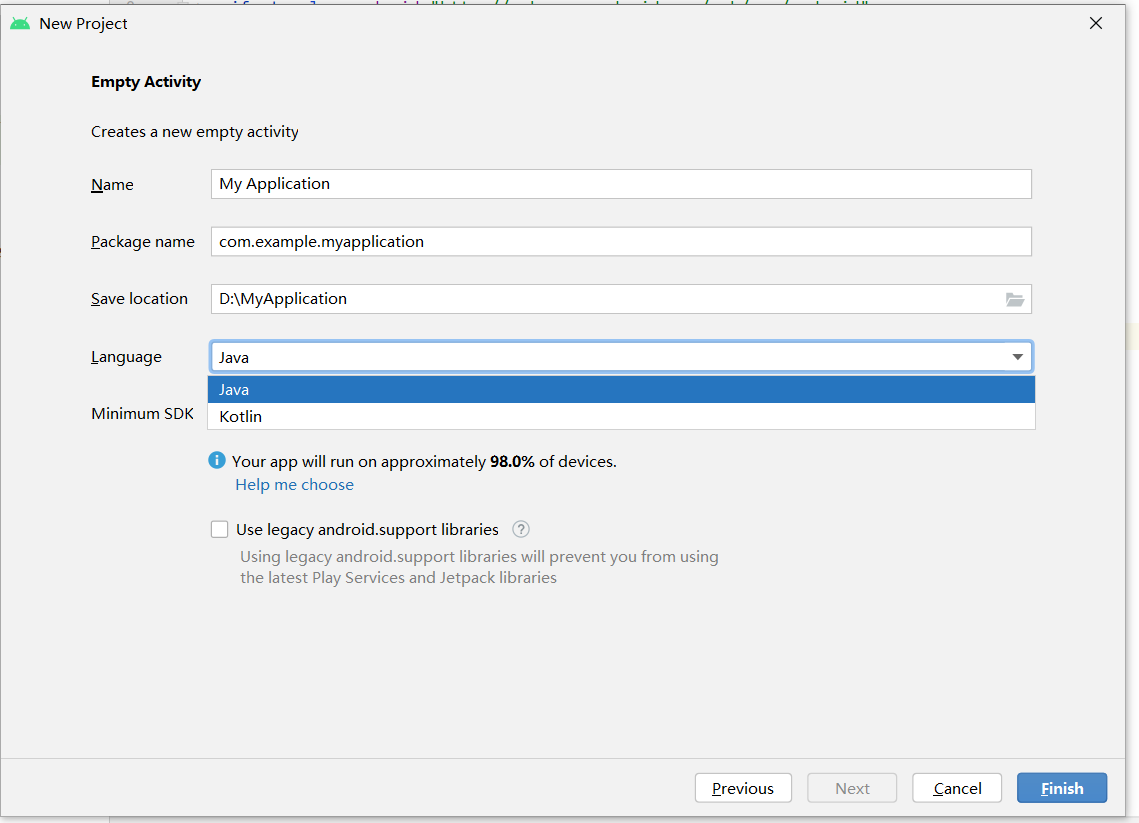 1、在新建projec项目时要选择java如图,创建完成后android文件中会有.java文件,里面可以编写点击事件。