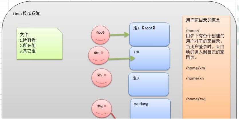 在 linux 中的每个用户必须属于一个组,不能独立于组外。在 linux 中每个文件有所有者,所在组、其它组的概念。